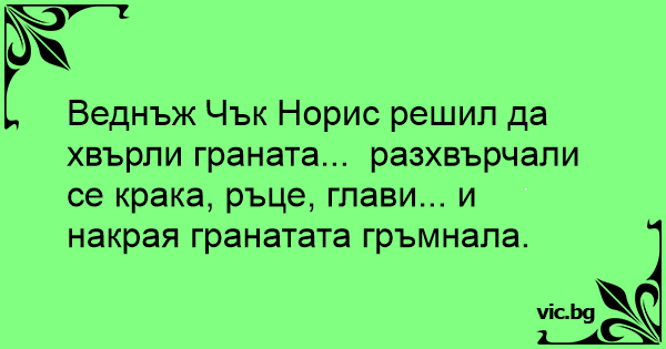 Веднъж Чък Норис решил да хвърли граната... разхвърчали се крака, ръце, глави... и накрая гранатата гръмнала.