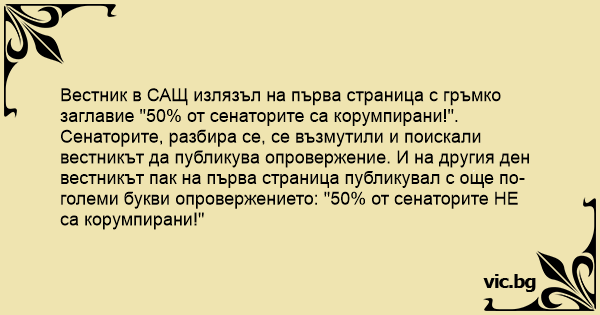 Сенаторите, разбира се, се възмутили и поискали вестникът да публикува опровержение. И на другия ден вестникът пак на първа страница публикувал с още по-големи букви опровержението: "50% от сенаторите НЕ са корумпирани!"