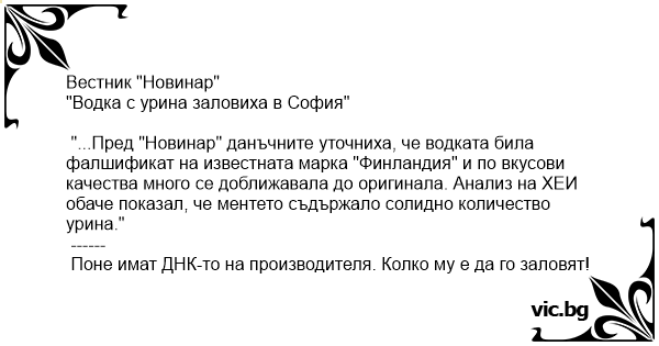 "...Пред "Новинар" данъчните уточниха, че водката била фалшификат на известната марка "Финландия" и по вкусови качества много се доближавала до оригинала. Анализ на ХЕИ обаче показал, че ментето съдържало солидно количество урина."