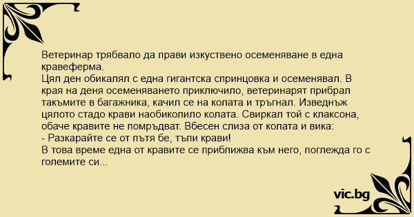 Цял ден обикалял с една гигантска спринцовка и осеменявал. В края на деня осеменяването приключило, ветеринарят прибрал такъмите в багажника, качил се на колата и тръгнал. Изведнъж цялото стадо крави наобиколило колата. Свиркал той с клаксона, обаче кравите не помръдват. Вбесен слиза от колата и вика:
