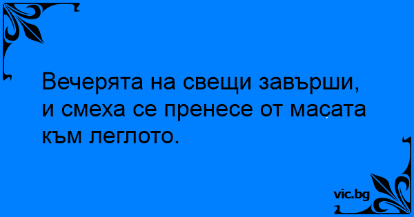 Вечерята на свещи завърши, и смеха се пренесе от масата към леглото.<br />