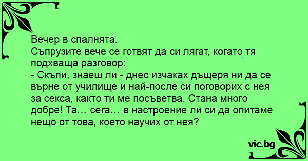 - Скъпи, знаеш ли - днес изчаках дъщеря ни да се върне от училище и най-после си поговорих с нея за cekca, както ти ме посъветва. Стана много добре! Та… сега… в настроение ли си да опитаме нещо от това, което научих от нея?