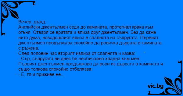 Първият джентълмен продължава да рови из дървата в камината и също толкова спокойно отбелязва:
