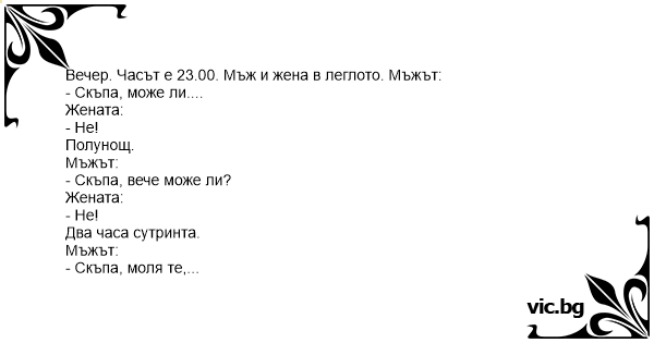 Вечер. Часът е 23.00. Мъж и жена в леглото. Мъжът:
