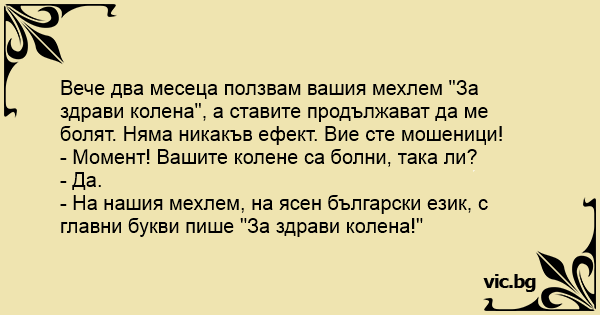 Вече два месеца ползвам вашия мехлем "За здрави колена", а ставите продължават да ме болят. Няма никакъв ефект. Вие сте мошеници!