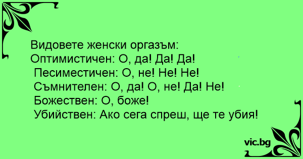 Kobiecy orgazm ma 5 form: 1. Relaksacyjna: Ach, ach, ach. 2. Uległa: Tak, tak, tak. 3. Geograficzna: Tuu, tuu, tuuu. 4. Religijna: O mój Boże! 5. Kryminalna: Zabiję Cię, jeśli teraz przestaniesz!