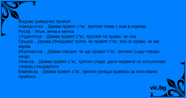 Македонска: - Двама правят cekc, третият лежи с нож в корема.