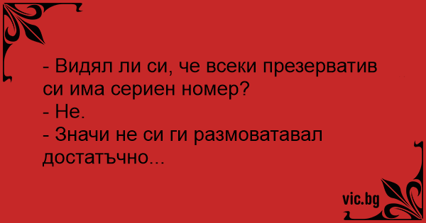 - Видял ли си, че всеки пpeзepbatиb си има сериен номер?<br />- Не.<br />- Значи не си ги размоватавал достатъчно...
