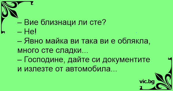 - Добар ден... - Добар ден, извинете, дали сте близнаци? - Не, зошто прашувате? - Па, мајка ви исто ве облекла, баш сте слатки! - Господине, ве молам излезете од автомобилиот и донесете ја возачката и сообраќајната дозвола!