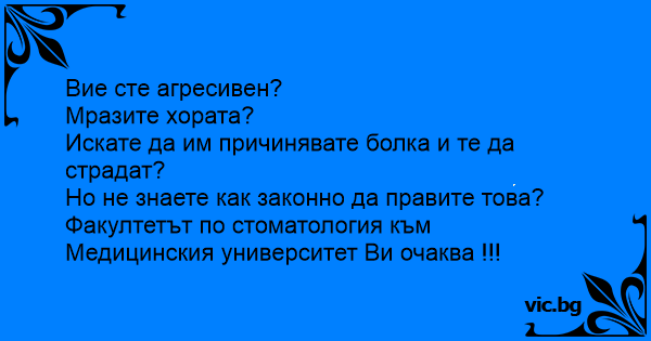 Вы агрессивны? Вы ненавидите людей? Вам хочется унижать и причинять боль? Не знаете как делать это законно? ФАКУЛЬТЕТ СТОМАТОЛОГИИ МЕДИЦИНСКОГО УНИВЕРСИТЕТА ЖДЕТ ВАС!