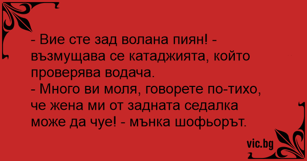 - Много ви моля, говорете по-тихо, че жена ми от задната седалка може да чуе! - мънка шофьорът.