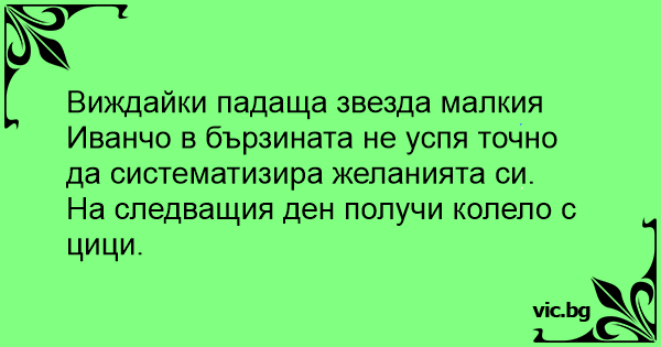 Иванчо видял падаща звезда и в бързината се зачудил какво да си пожелае.