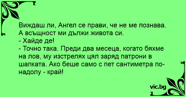 - Точно така. Преди два месеца, когато бяхме на лов, му изстрелях цял заряд патрони в шапката. Ако беше само с пет сантиметра по-надолу - край!