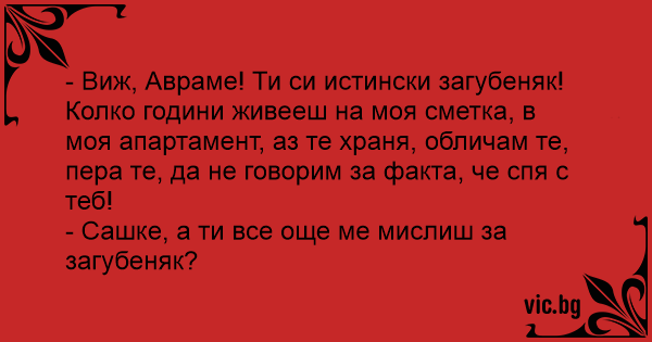 - Виж, Авраме! Ти си истински загубеняк! Колко години живееш на моя сметка, в моя апартамент, аз те храня, обличам те, пера те, да не говорим за факта, че спя с теб!