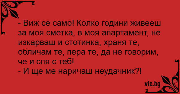 - Виж се само! Колко години живееш за моя сметка, в моя апартамент, не изкарваш и стотинка, храня те, обличам те, пера те, да не говорим, че и спя с теб!