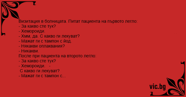 Визитация в болницата. Питат пациента на първото легло: