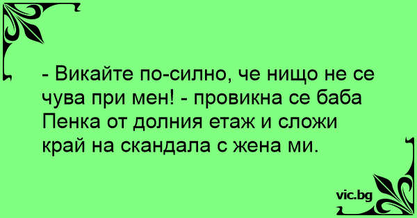 - Викайте по-силно, че нищо не се чува при мен! - провикна се баба Пенка от долния етаж и сложи край на скандала с жена ми.