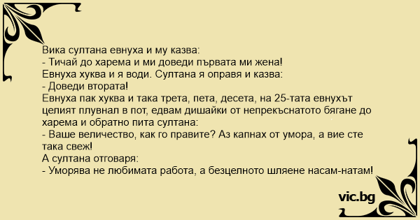 Евнуха пак хуква и така трета, пета, десета, на 25-тата евнухът целият плувнал в пот, едвам дишайки от непрекъснатото бягане до харема и обратно пита султана:
