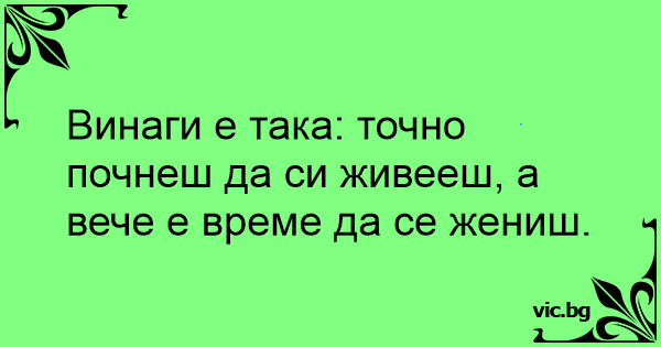 Винаги е така: точно почнеш да си живееш, а вече е време да се жениш.