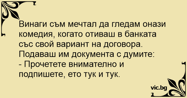 Винаги съм мечтал да гледам онази комедия, когато отиваш в банката със свой вариант на договора.