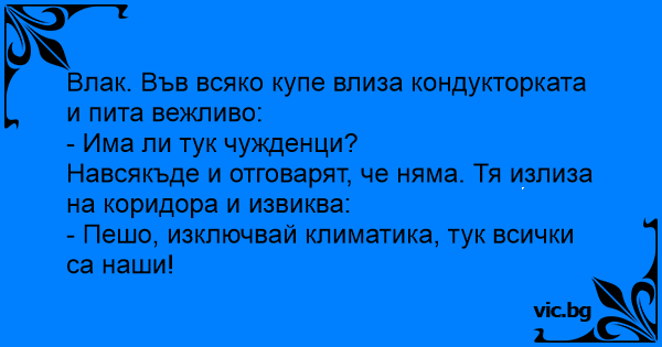 Влак. Във всяко купе влиза кондукторката и пита вежливо: