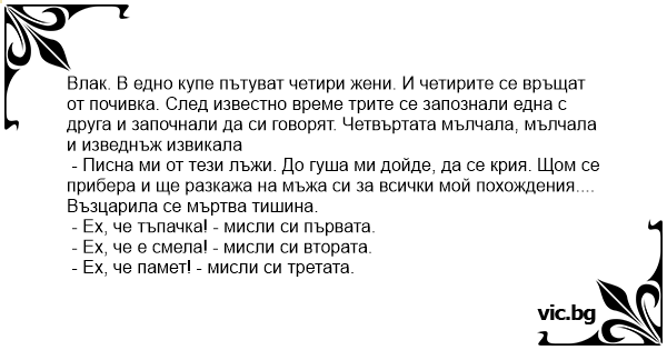 Влак. В едно купе пътуват четири жени. И четирите се връщат от почивка. След известно време трите се запознали една с друга и започнали да си говорят. Четвъртата мълчала, мълчала и изведнъж извикала