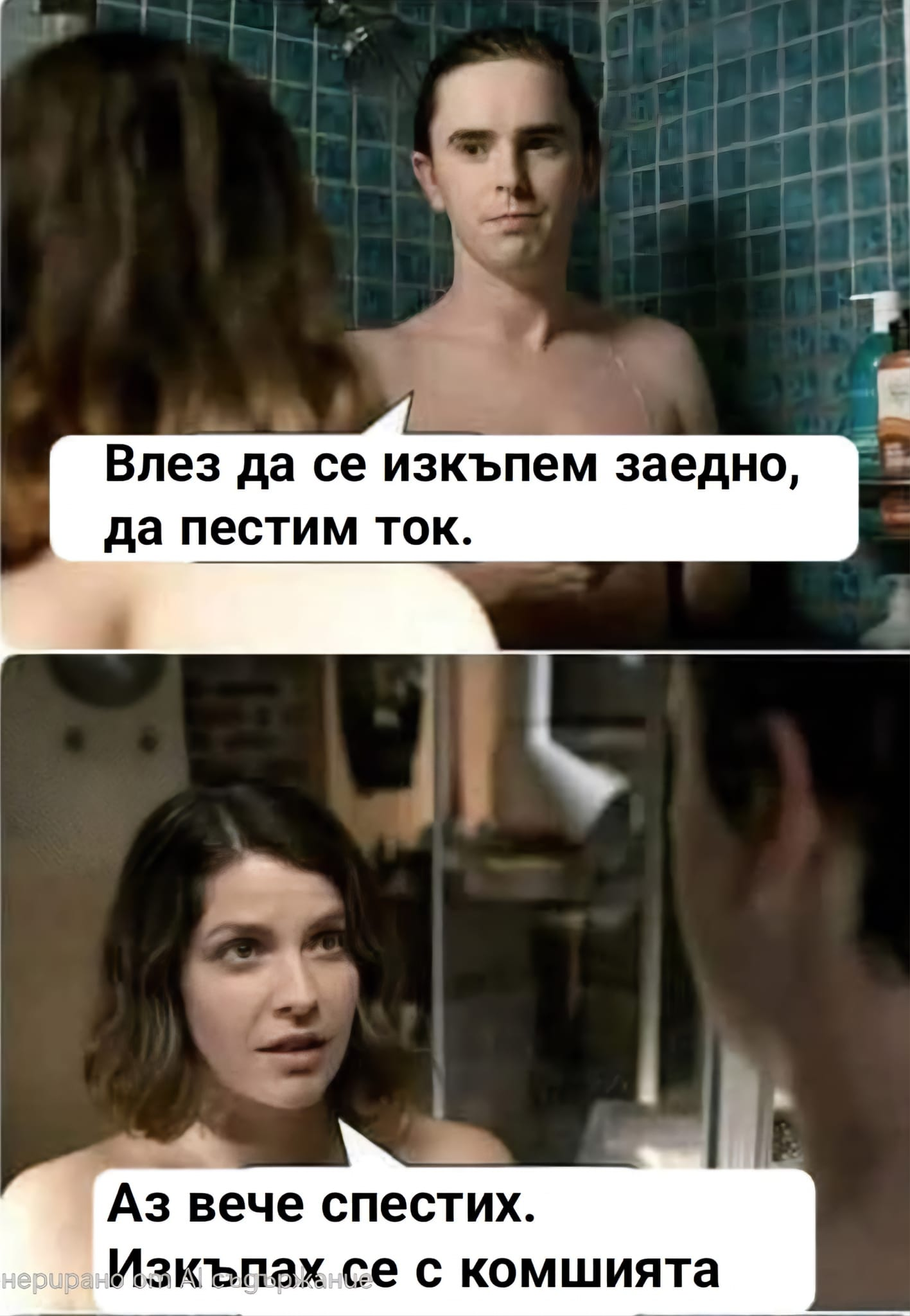 Влез да се изкъпем заедно, да пестим ток. Аз вече спестих. Изкъпах се с комшията