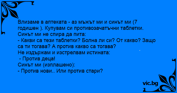 Влизаме в аптеката - аз мъжът ми и синът ми (7 годишен ). Купувам си противозачатъчни таблетки. Синът ми не спира да пита: