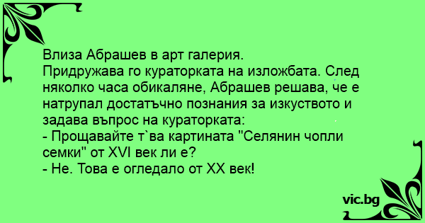 Придружава го кураторката на изложбата. След няколко часа обикаляне, Абрашев решава, че е натрупал достатъчно познания за изкуството и задава въпрос на кураторката: