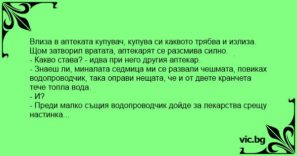 Влиза в аптеката купувач, купува си каквото трябва и излиза. Щом затворил вратата, аптекарят се разсмива силно.