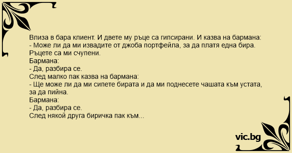 - Може ли да ми извадите от джоба портфейла, за да платя една бира. Ръцете са ми счупени.