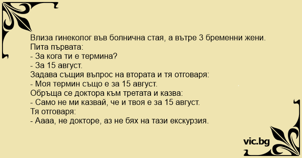 Влиза гинеколог във болнична стая, а вътре 3 бременни жени. Пита първата: