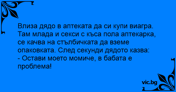 Там млада и cekcи с къса пола аптекарка, се качва на стълбичката да вземе опаковката. След секунди дядото казва: