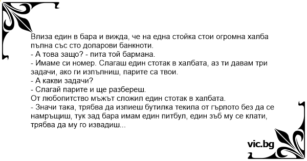 - Имаме си номер. Слагаш един стотак в халбата, аз ти давам три задачи, ако ги изпълниш, парите са твои.