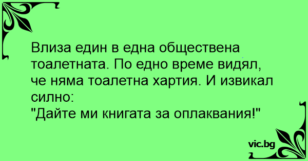 Влиза един в една обществена тоалетната. По едно време видял, че няма тоалетна хартия. И извикал силно: