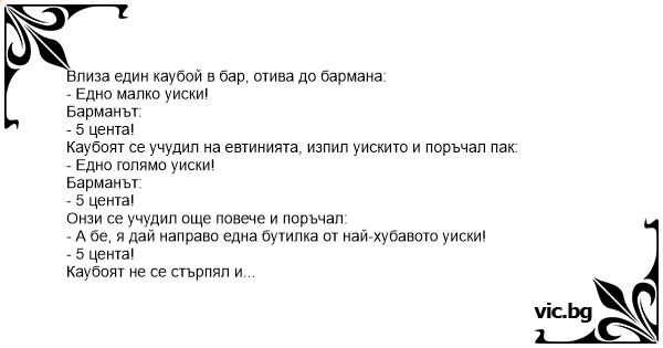 Каубоят се учудил на евтинията, изпил уискито и поръчал пак: