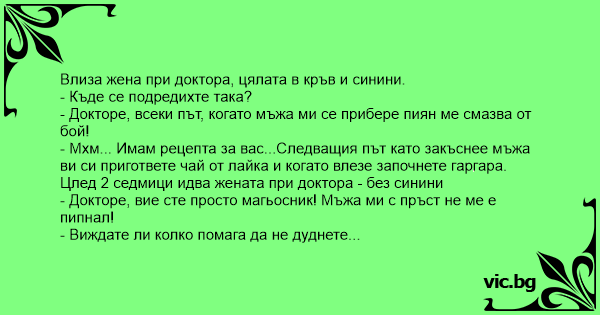 A woman who was beaten black and blue, went to the doctor. Doctor: "What happened?" Woman: "Doctor, I don’t know what to do. Every time my husband comes home drunk, he beats me to a pulp." Doctor:... A woman goes to the doctor all black and blue. Doctor: "What happened?" Woman: "Doctor, I don't know what to do. Every time my husband comes home drunk on Bud Light he beats me up." Doctor: "I have a real good medicine for that. When your husband comes home drunk on Bud Light, just take a glass... A woman goes to the Doctor, worried about her husband's temper. The doctor asks, "So what seems to be the problem?" Kommt eine Frau mit geschwollenem Gesicht zum Arzt und sagt: Frau geschlagen Како жената се спасила од ќотекот на пијаниот сопруг? Yüzü gözü mosmor bir kadın doktora gider. Doktor: - Hanımefendi ne oldu size? Kadın: - Doktor bey, ne yapacağımı bilemiyorum. Kocam ne zaman içip de eve sarhoş dönse beni bayıltana kadar dövüyor.... Een bont en blauw geslagen vrouw komt bij de dokter. De dokter vraagt onmiddellijk wat er gebeurt is. De vrouw zegt “Elke keer als mijn man dronken thuis komt, slaat hij mij bont en blauw..” De... a woman goes to the doctor with a black eye, and really lookind rough. the doc says, "what happened?" the woman replies, "everytime my husband goes out and gets drunk on beer he beats me when he... Une femme entre chez son médecin, le visage tout enflé et des bleus partout... Le médecin : - Que vous est-il arrivé ? La femme : - Docteur, chaque fois que mon mari arrive à la maison après avoir...