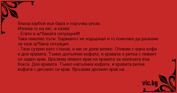 Така няколко пъти. Барманът не издържал и го помолил да разкаже за тази шибана ситуация.
