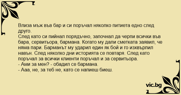 След като си пийнал порядъчно, започнал да черпи всички във бара, сервитьора, бармана. Когато му дали сметката заявил, че няма пари. Барманът му ударил един як бой и го изхвърлил навън. След няколко дни историята се повтаря. След като поръчал за всички клиенти поръчал и за сервитьора.