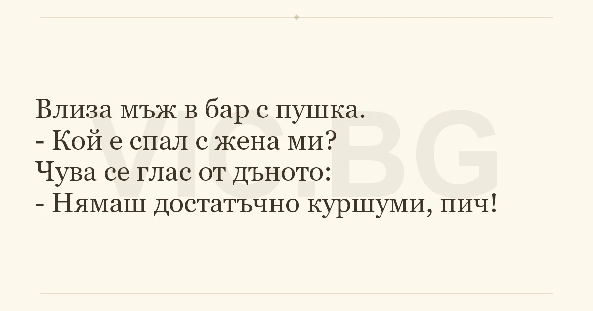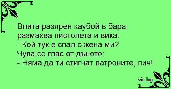 Влиза мъж в бар с пушка. - Кой е спал с жена ми? Чува се глас от дъното: - Нямаш достатъчно куршуми, пич!