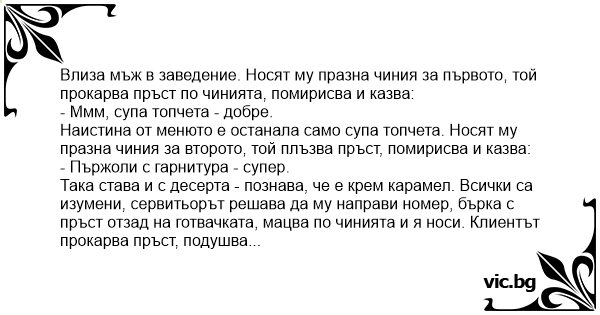 Влиза мъж в заведение. Носят му празна чиния за първото, той прокарва пръст по чинията, помирисва и казва:
