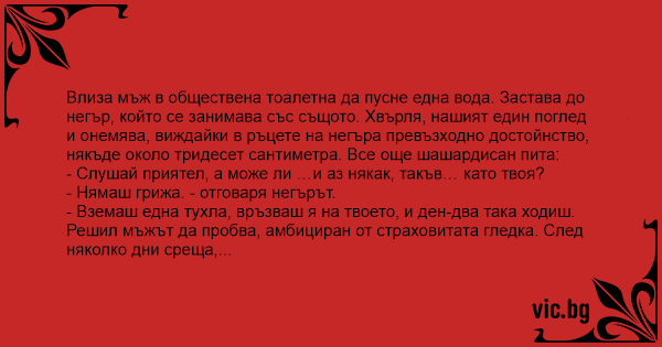 Влиза мъж в обществена тоалетна да пусне една вода. Застава до нeгъp, който се занимава със същото. Хвърля, нашият един поглед и онемява, виждайки в ръцете на негъра превъзходно достойнство, някъде около тридесет сантиметра. Все още шашардисан пита: