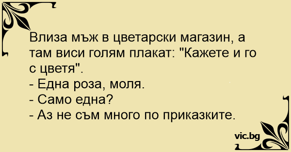 Влиза мъж в цветарски магазин, а там виси голям плакат: "Кажете и го с цветя".