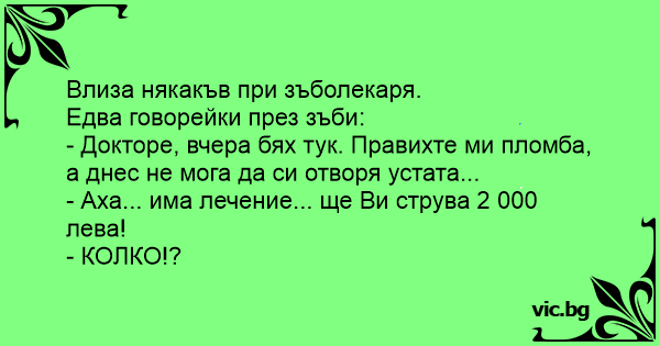 - Докторе, вчера бях тук. Правихте ми пломба, а днес не мога да си отворя устата...