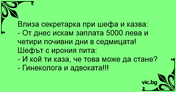 Секретарката влегува кај шефот и вели: - Од овој момент платата ќе ми биде 1000 евра и ќе имам 4 слободни денови во неделата... Шефот со сарказам: - А кој ти го рече тоа мила? - Мојот гинеколог, а...