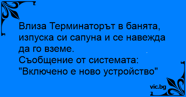 Влиза Терминаторът в банята, изпуска си сапуна и се навежда да го вземе.