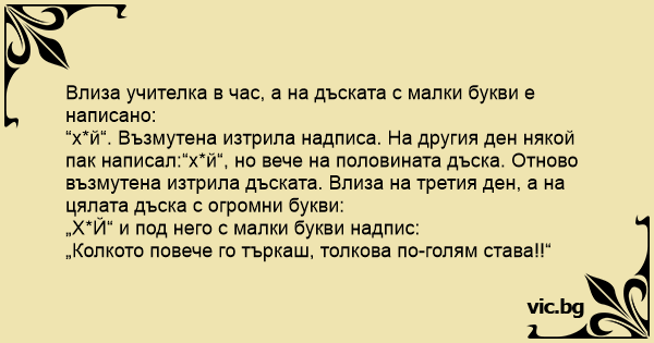 “хуй“. Възмутена изтрила надписа. На другия ден някой пак написал:“хуй“, но вече на половината дъска. Отново възмутена изтрила дъската. Влиза на третия ден, а на цялата дъска с огромни букви: