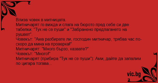 Митничарят го вижда и слага на бюрото пред себе си две табелки: "Тук не се пуши" и "Забранено предлагането на рушвет".