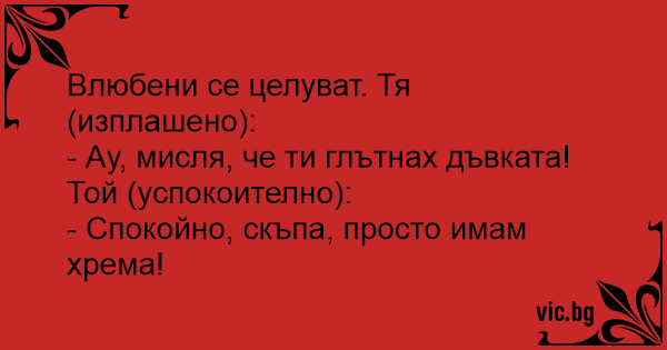 Due adolescenti sono seduti a sbaciucchiarsi su una panchina. Lei: “Ehi, credo di avere inghiottito il tuo chewing-gum !”. Lui: “No, non ti preoccupare, sono solo un po’ raffreddato…”
