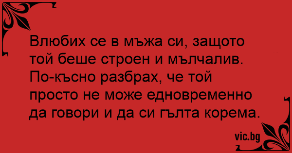 Влюбих се в мъжа си, защото той беше строен и мълчалив. По-късно разбрах, че той просто не може едновременно да говори и да си гълта корема.